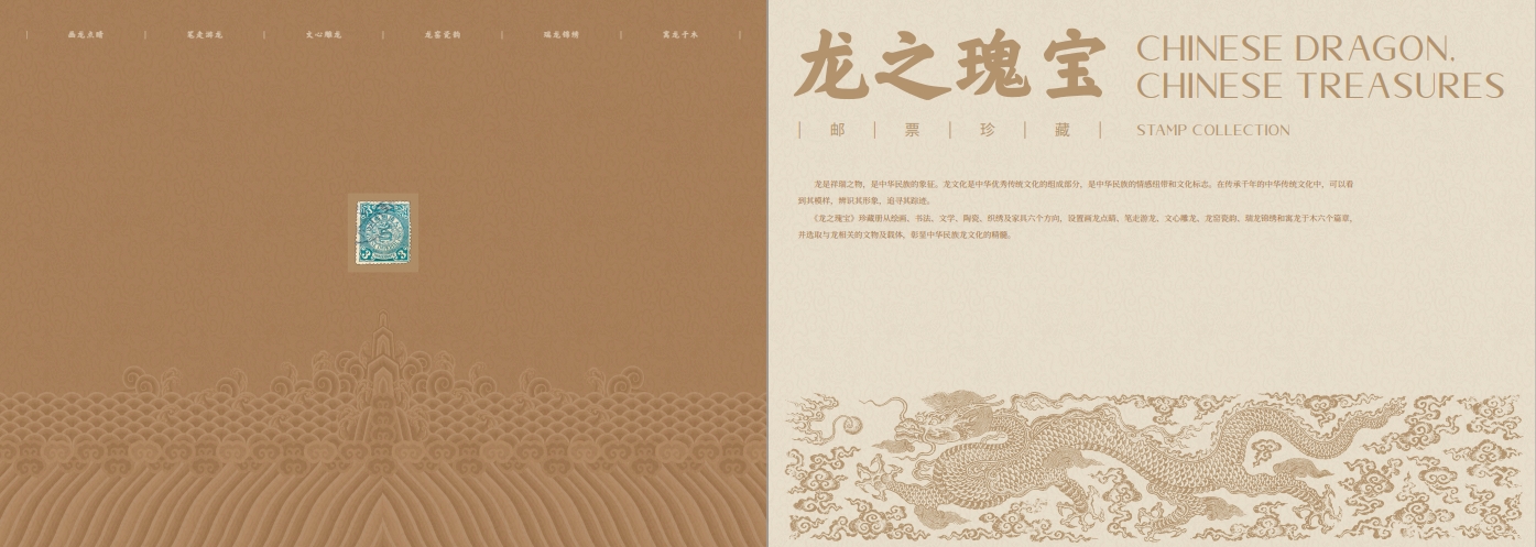 《龙之瑰宝》珍藏册从绘画、书法、文学、陶瓷、织绣及家具六个方向,设置画龙点睛、笔走游龙、文心雕龙、龙窑瓷韵、瑞龙锦绣和寓龙于木六个篇章, 并选取与龙相关的文物及载体,彰显中华民族龙文化的精髓。