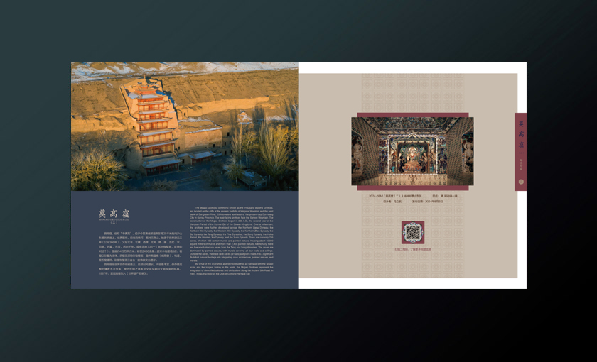 内文选用九层楼等莫高窟经典建筑图、邮票下方衬托新邮中的藻井图案提取元素。契合主题内容。 在邮票周围新增莫高窟洞窟介绍的二维码图,使受众可以全方位了解莫高窟的艺术文化。