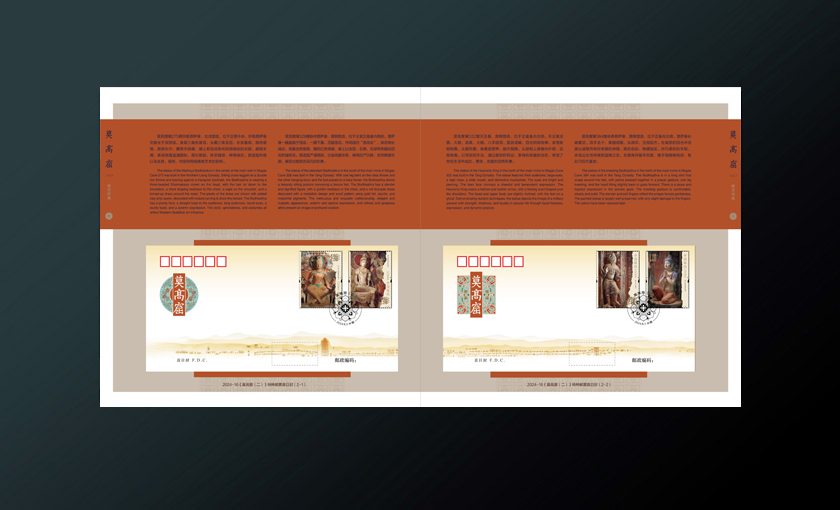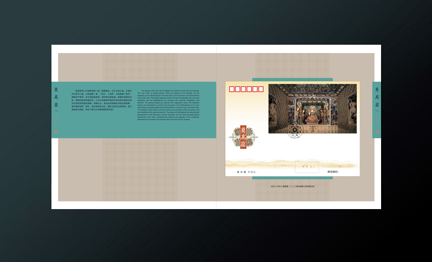 邮册插套选用莫高窟远景、岩壁、沙丘等元素作为主体,远景以莫高窟壁画中飞天的绸带造型衬托,突出主题营造神秘氛围。封面选用新邮中体现的洞窟彩塑、壁画元素,与插套上建筑远景形成呼应展现视觉深入探访的感受。整体色调取洞窟壁画、彩塑的基调达成统一的视觉体验。