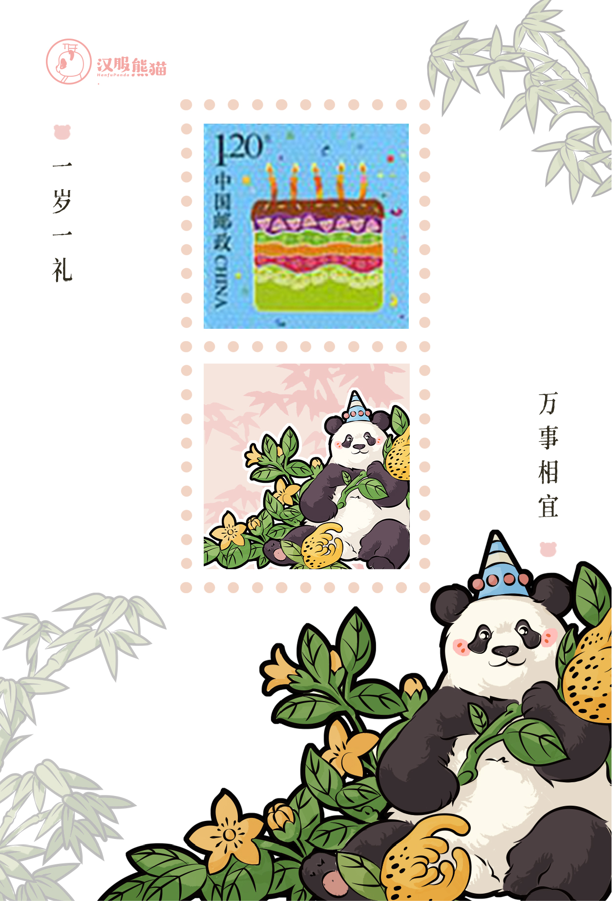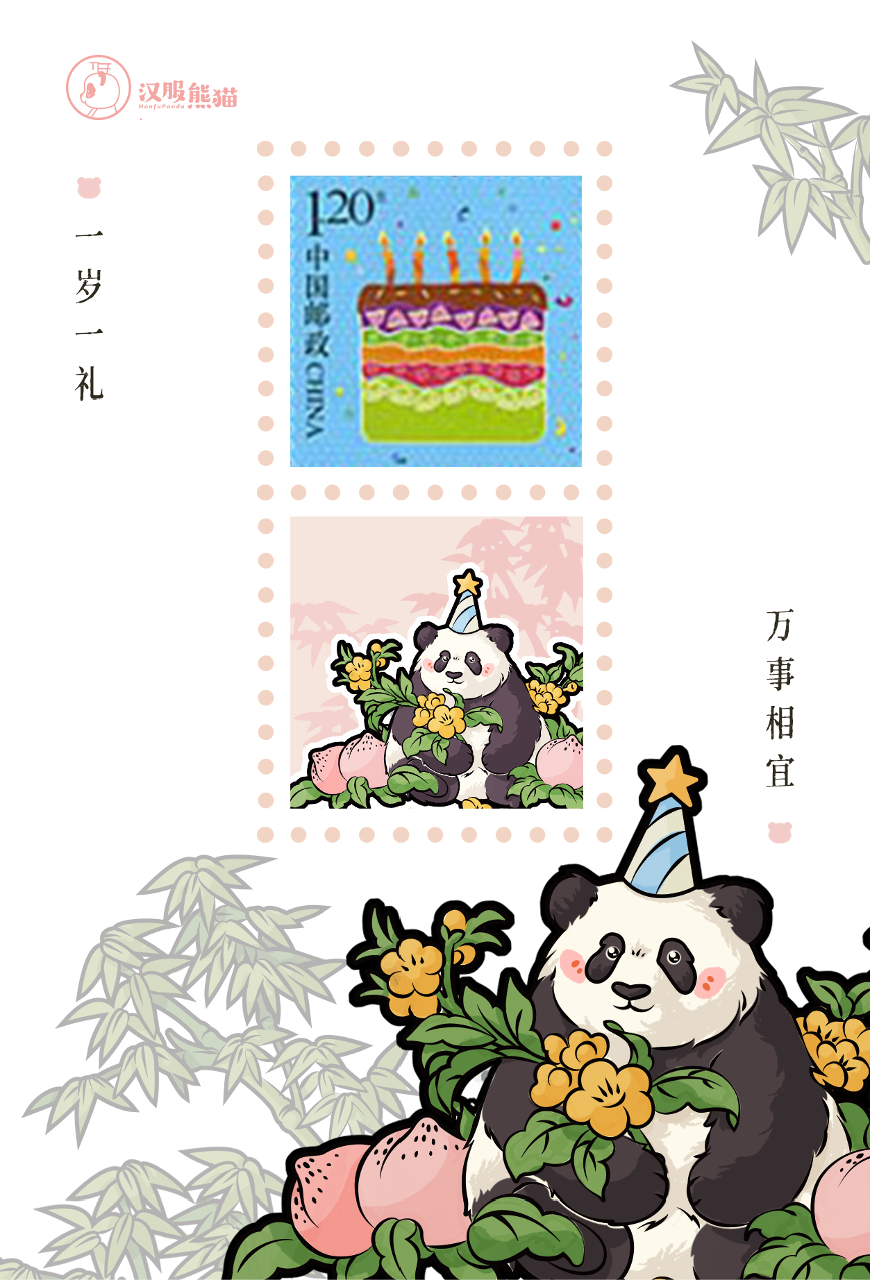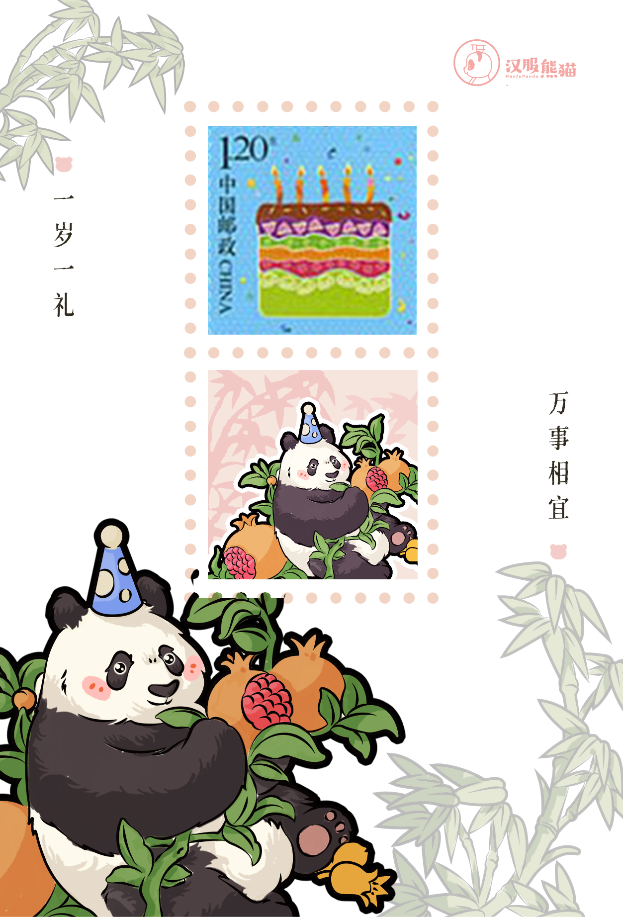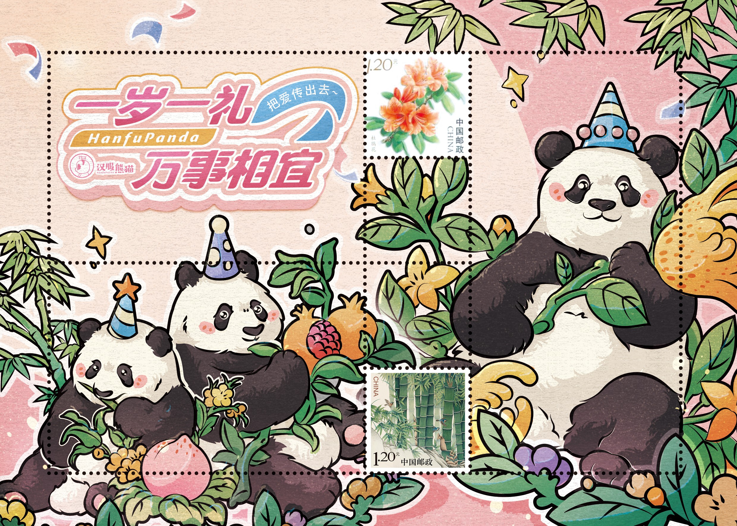 三只熊猫形象,均参考“网红熊猫“原形设计。所搭配的植物和水果,均有吉祥祝福寓意和文化内涵。 主图“竹子”,既是熊猫的主要食物,也象征着“竹子开花节节高”的祝福寓意。主图“杜鹃花”,跟熊猫的分布地一致,是原产于中国的花卉品种。其象征寓意包活“顽强生命力和忠贞的爱情”。