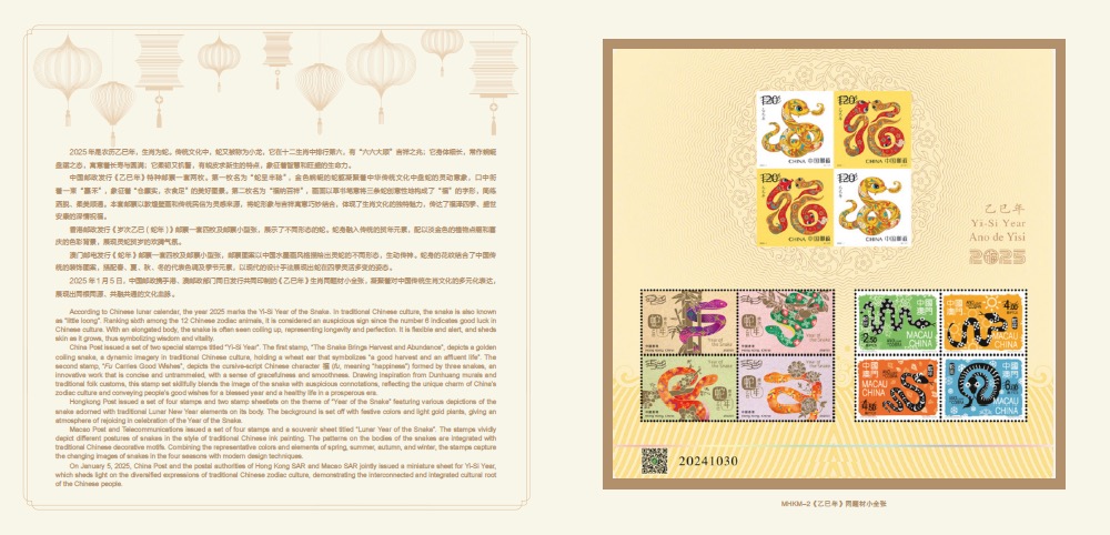 中国集邮有限公司于2025年1月5日发行《蛇舞长虹》乙巳年同题材生肖邮折,内放《乙巳年》同题材生肖小全张。
