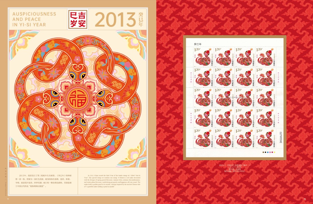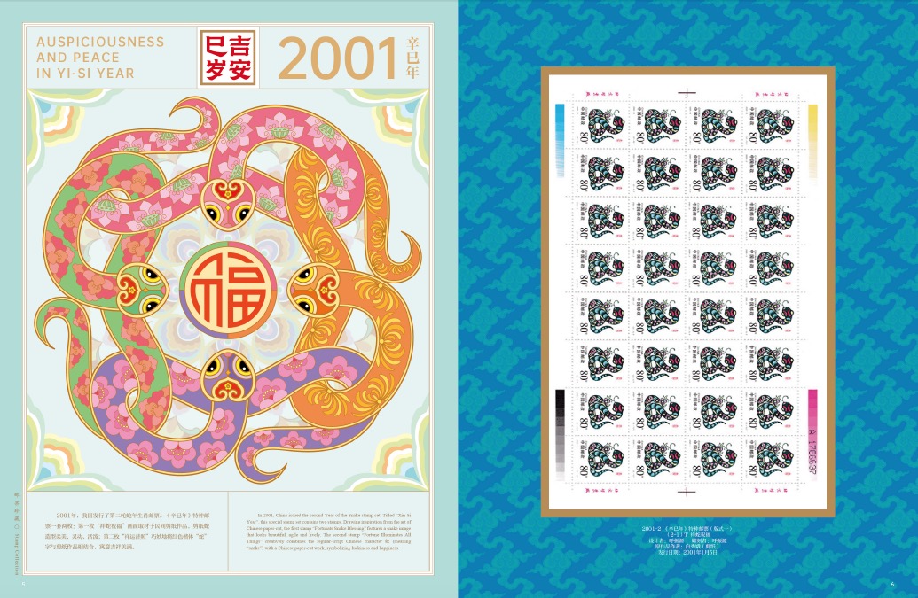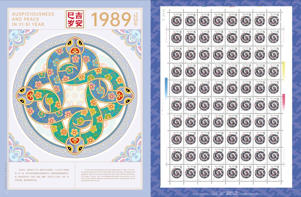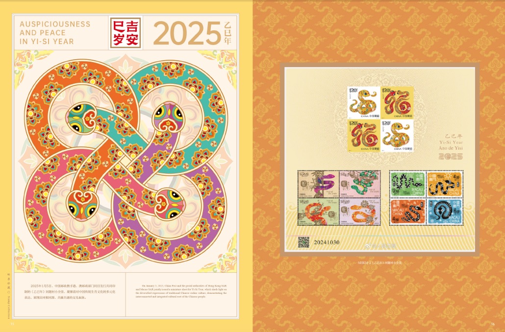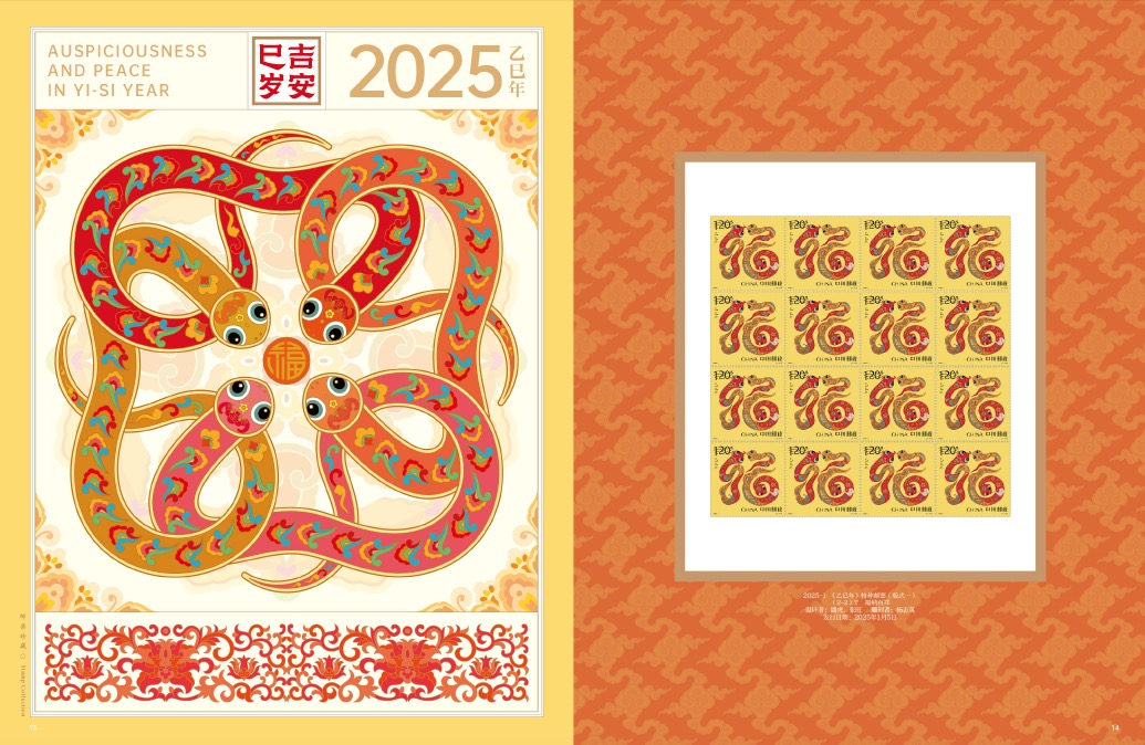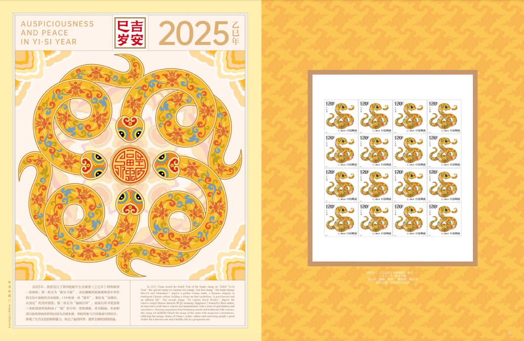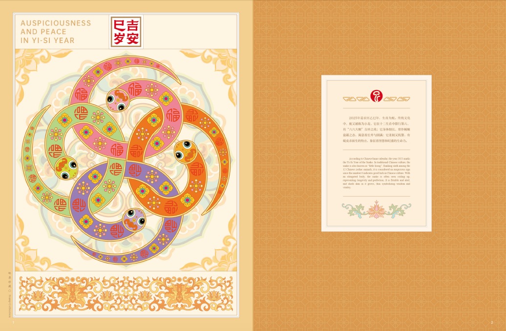 中国集邮有限公司于2025年1月5日发行《巳吉岁安》蛇年生肖邮票珍藏卡书,内放T.133《己巳年》、2001-2《辛巳年》、2013-1《癸巳年》、2025-1《乙巳年》版式一及MHKM-2己巳年同题材小全张。
