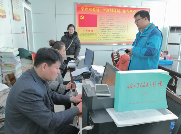 自12月中旬以来,济宁市任城寄递事业部抽调业务骨干带上报刊收订终端、发票打印设备进驻党政机关进行畅销报刊和党报党刊的收订,受到相关单位的欢迎。截至目前,任城寄递事业部已将当地100余个重点单位2019年度报刊订阅手续办理完毕,使辖区重点单位客户足不出户就能订阅报刊,得到了订阅单位的一致好评。图为济宁市任城寄递事业部业务骨干上门为客户办理党报党刊收订业务。