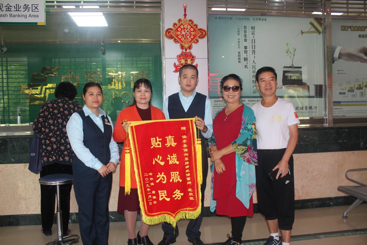 1月4日上午9点,来自黑龙江的唐淑云夫妇将写着“真诚服务,贴心为民”的锦旗送到海南省保亭黎族苗族自治县分公司保兴东路营业所,感谢该网点员工范欣俊为他们提供的真诚服务。