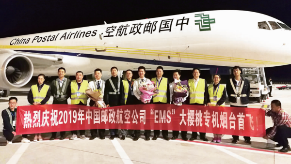 5月26日晚11时,由中国邮政速递物流股份有限公司山东省分公司调配的中国邮政航空公司B757货运飞机从蓬莱国际机场满载11000箱烟台大樱桃首飞发往南京机场,拉开了2019年烟台邮政航空寄递大樱桃的序幕。