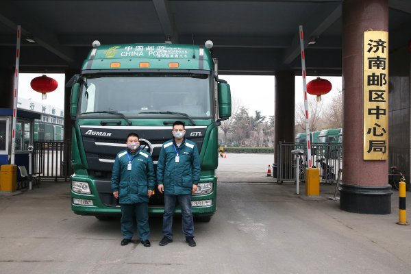 ▲济南邮区中心局员工正在为发往武汉的抗疫情物资装车。