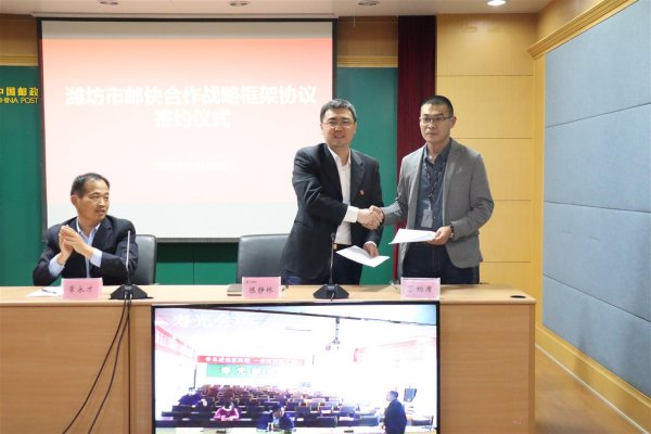 10月28日下午,潍坊市邮政分公司与当地快递企业举行“邮快合作”战略框架协议签约仪式,标志着潍坊“邮快合作”开启了新征程。签约仪式上,潍坊邮政与顺丰、圆通、中通、申通、韵达、百世、京东、德邦等8家主要品牌快递企业签约,各县市区邮政分公司也与当地快递企业签约。