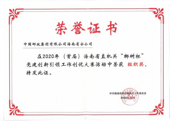 近日,海南省分公司荣获2020年(首届)海南省直机关 “椰树杯”党建创新引领工作创优大赛组织奖。