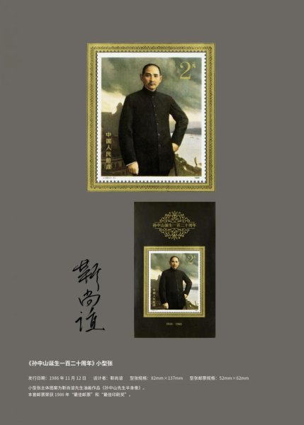 小型张主体图案《孙中山先生半身像》为靳尚谊先生创作。本套邮票荣获1986年“最佳邮票”和“最佳印刷奖”。