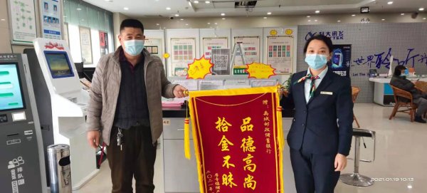 1月19日,禹城市民耿先生为禹城人民路邮政支局送来了一面“拾金不昧品德高尚”的锦旗,感谢禹城邮政员工将1万元现金送回到自己手中。耿先生激动地说:“真是太谢谢你们了,不是你们打电话我还不知道钱丢了。”
