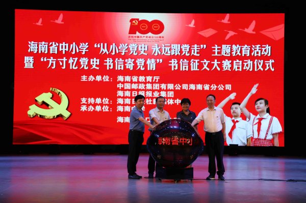 为庆祝中国共产党建党100周年华诞,5月6日,海南省教育厅、中国邮政集团有限公司海南省分公司、海南日报报业集团联合举办的“方寸忆党史 书信寄党情”全省青少年重温红色记忆文化活动在海南中学正式启动。活动旨在通过回顾党从诞生到发展壮大的光辉历程,培养青少年继承党的优良传统,提升听党话、感党恩、跟党走的思想自觉和行动自觉,时刻准备做合格的社会主义建设者和接班人。