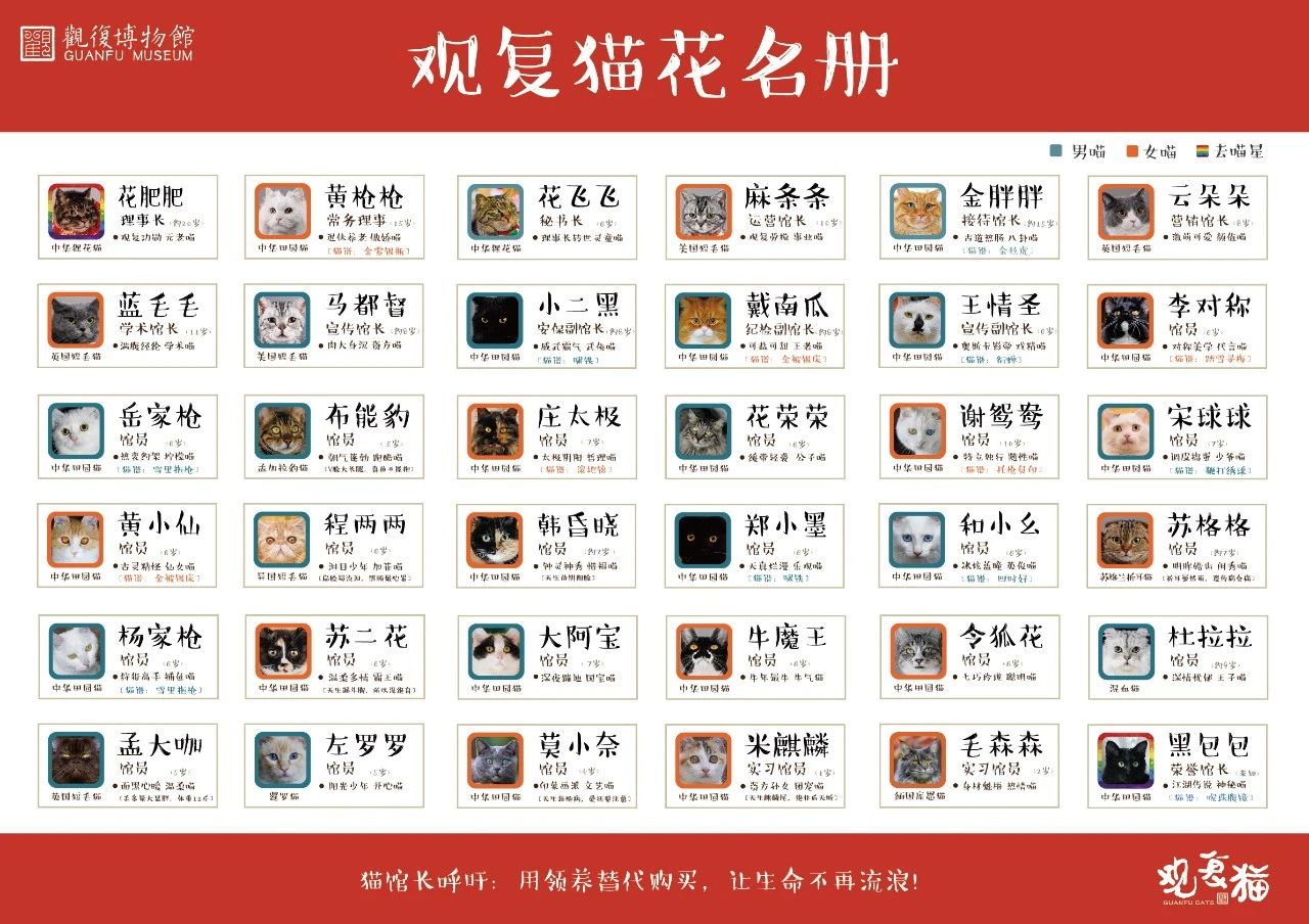 在《观复猫花名册》上,明确标注有全体“猫馆员”的品种、职务、年龄、性格。如上文提到的“花肥肥”在花名册中排名第一位,是理事长,约20岁,属中华狸花猫,是观复功勋,元老喵。