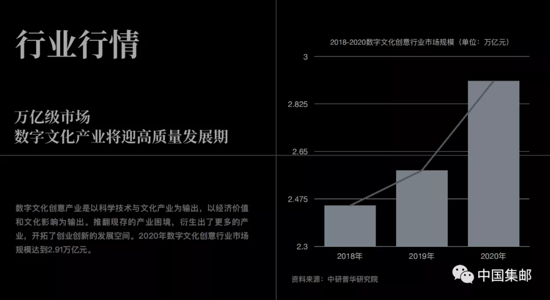一、国家政策与行业行情。政策方面,党的十八大以来,文化产业被视为朝阳产业越来越受到重视,一系列政策文件相继出台,新型文化业态不断推进,艺术与科技不断结合,逐渐走进人民生活。行业行情方面,2020年,中国数字化经济收入为5.4万亿元,居世界第二。根据测算,未来15年,中国数字化经济规模可达25万亿元。文化产业既有政策支持,又符合国家战略,前景广阔,具天时之利。