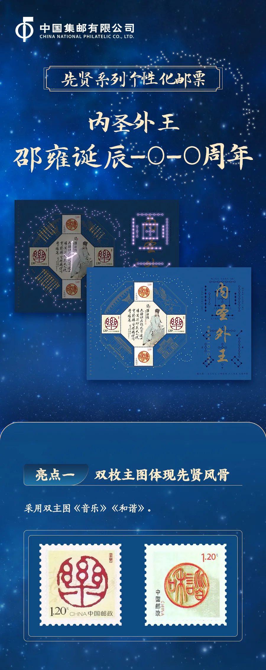 今年是“北宋五子”之一的邵雍诞辰一〇一〇周年,也是北宋宰相、改革家王安石诞辰一千周年。中国集邮有限公司特别发行《内圣外王——邵雍诞辰一〇一〇周年》个性化邮票、《王安石诞辰一千周年》个性化邮票,两套邮票的图稿在发布会上正式揭晓。