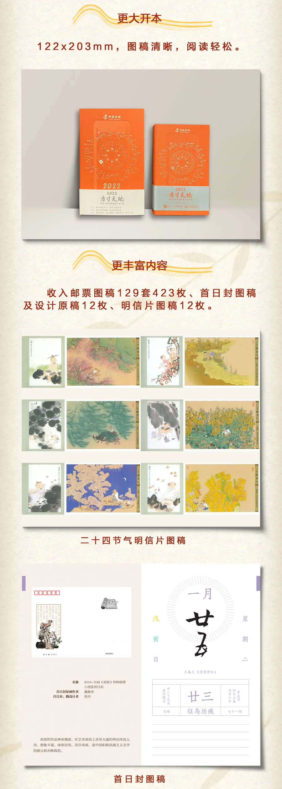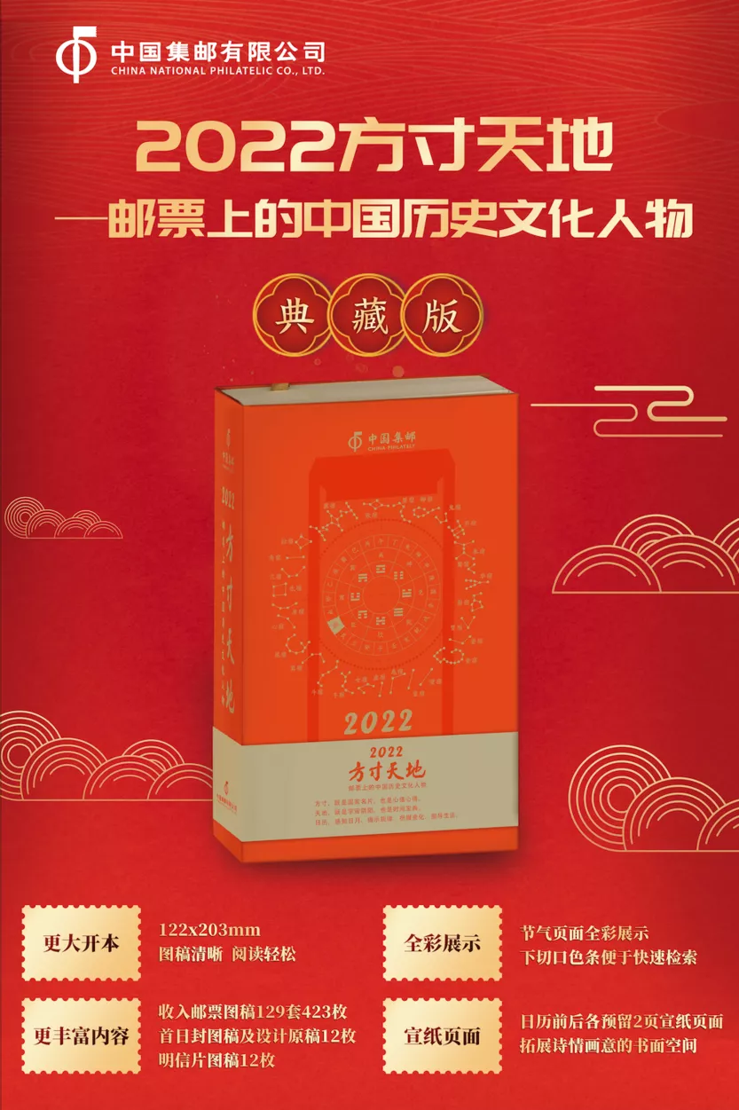 2022集邮日历《方寸天地——邮票上的中国历史文化人物》典藏版,以时间为经、以史事为纬、以邮票为媒,将已发行邮票上的138位中国历史文化人物及相关的故事、作品按照历史脉络呈现,收入中国历史文化人物、节日、节气、生肖相关邮票图稿129套423枚、首日封图稿及设计原稿12枚、明信片图稿12枚。