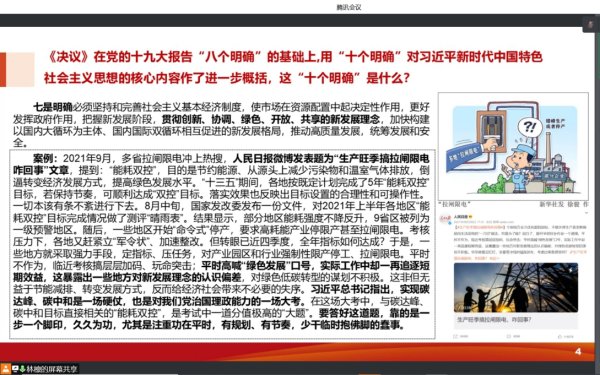团委书记林檩以“《决议》在党的十九大报告‘八个明确’的基础上,用‘十个明确’对习近平新时代中国特色社会主义思想的核心内容作了进一步概括,这‘十个明确’是什么?”为主题,针对贯彻新发展理念、全面从严治党等内容,以2021年下旬多省拉闸限电的事件为例,阐释了应该完整、准确、全面贯彻新发展理念;通过《零容忍》中95后青年、原安徽滁州市不动产登记中心基层工作人员张雨杰侵吞公款的案例,告诫团干部和青年要在工作中廉洁用权、守住底线。