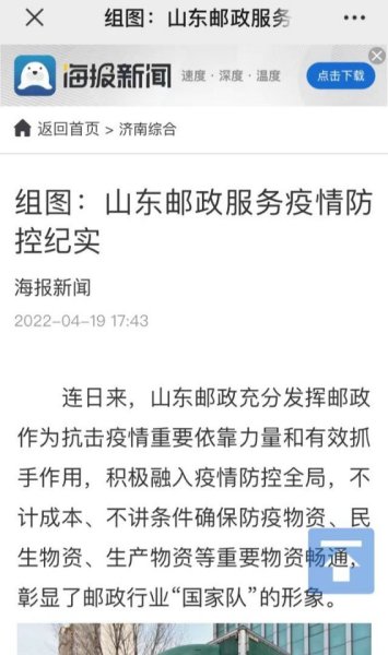 海报新闻4月19日报道山东邮政服务疫情防控大局
