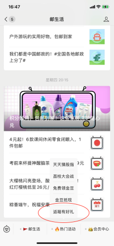 关注微信公众号“邮生活”,在热门活动页-“返箱有好礼”活动专区,点击进入,进行邮金豆、“EMS寄递满减券,二者选一。