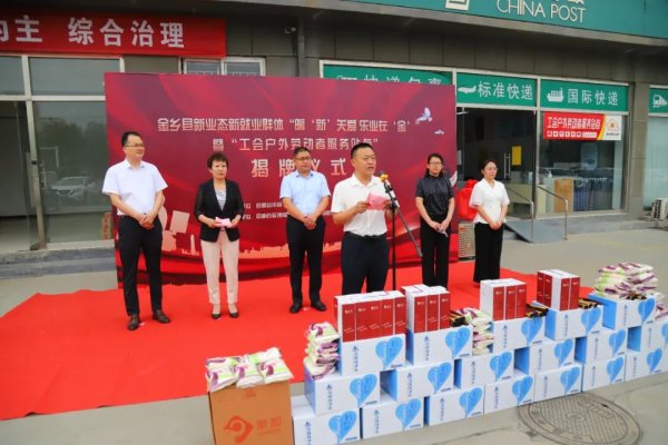 7月10日,金乡县总工会联合县委组织部、县交通运输局、邮政公司举行新业态新就业群体“暖‘新’关爱 乐业在‘金’”暨“工会户外劳动者服务站点”揭牌仪式。县委组织部副部长周启山,县总工会党组书记、常务副主席周爱军,县交通运输局党组成员、邮政管理局局长郭凤荣,金乡邮政公司总经理郭祥珍等有关同志出席揭牌仪式。揭牌仪式在邮政公司金宇营业厅新业态户外劳动者服务站点举行,30多名新业态户外劳动者代表参与此次活动。周爱军强调,新业态户外劳动者是广大劳动群众的重要组成部分,小小的“劳动者服务站点”不仅是党和政府对新业态户外劳动者的关怀,同时也是弘扬劳动精神,尊重劳动者的具体举措。服务站点内配备了冰箱、饮水机、座椅、茶几、药箱、常用药品、雨伞、充电设备、报刊杂志等设施,为户外劳动者提供饮水、纳凉、取暖、避雨、充电等爱心服务,很大程度上解决了户外劳动者“吃饭难、喝水难、休息难、充电难”等现实问题。
