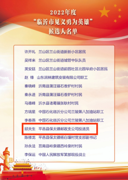 临沂市平邑县保太镇邮政支局投递员邱夫生入选2022年度“临沂市见义勇为英雄”候选人名单