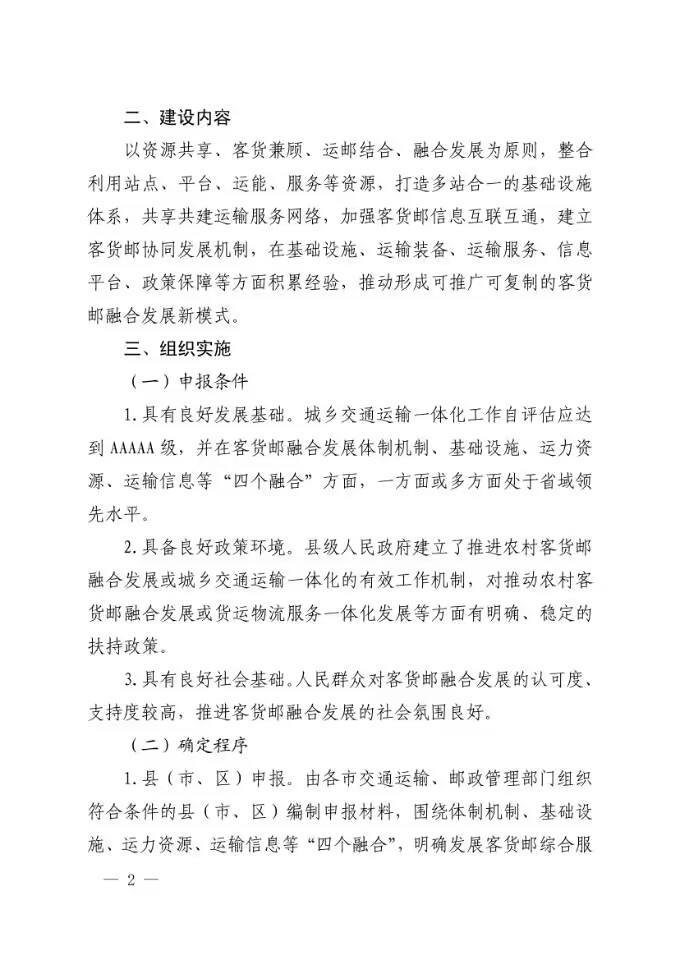 2.具备良好政策环境。县级人民政府建立了推进农村客货邮融合发展或城乡交通运输一体化的有效工作机制,对推动农村客 货邮融合发展或货运物流服务一体化发展等方面有明确、稳定的扶持政策。