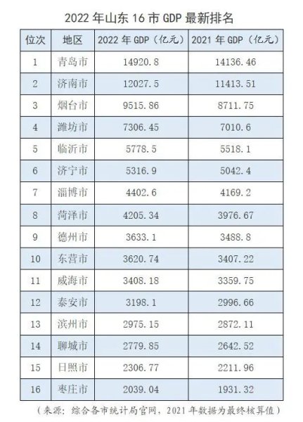 2022年,山东省实现地区生产总值(GDP)87435亿元,稳居全国第三位。截至2023年2月10日,综合各市公布的信息,16市生产总值都已超过2000亿元。其中,青岛、济南两座万亿之城位居第一方阵,烟台市坐稳第三,2023年很有希望破万亿;东营市跻身前十,菏泽市紧追淄博市。