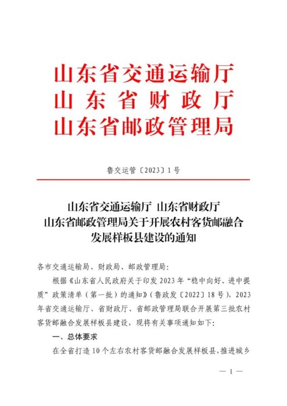 根据《山东省人民政府关于印发 2023 “稳中向好、进中提”政策清单(第一批)的通知》(鲁政发〔2022〕18 ),2023年省交通运输厅、省财政厅、省邮政管理局联合开展第三批农村客货邮融合发展样板县建设,现将有关事项通知如下:
