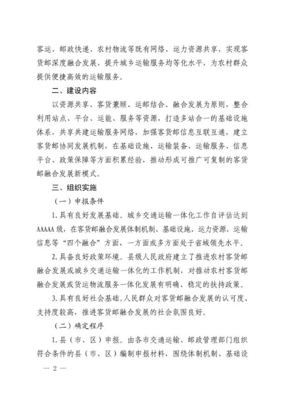 2.市级推荐。各市交通运输、邮政管理部门应对申报材料提 出审核意见,优先推荐在农村物流服务品牌建设和“快递进村” 工作成绩突出的县(市、区),并将推荐理由及样板县建设工作方案报省交通运输厅。