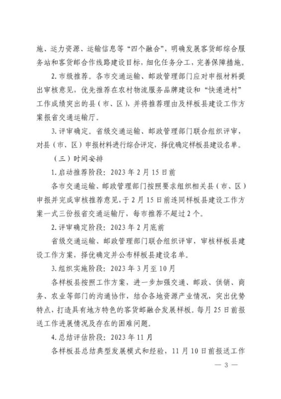 3.评审确定。省级交通运输、邮政管理部门联合组织评审,对县(市、区)申报材料进行综合评定,择优确定样板县建设名单。