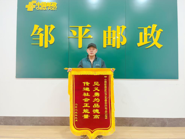 近日,邹平一家单位将写有“见义勇为品德高 传递社会正能量”的锦旗送到邹平分公司,向快递小哥郭道贵表示感谢。据悉一个月前,邹平一居民楼着火,滚滚浓烟淹没了楼道,郭道贵恰巧在附近投递邮件,眼看火势蔓延,在可视度极低的情况下,他毫不犹豫地迅速冲到楼道内,快速找到起火位置,他抄起厕所里的水桶接水泼灭了火苗。因浓烟太大、火烟呛人,几经周折,才把蔓延的火苗扑灭,等他出来时,脸上身上都熏得黢黑。此时,楼外已拉起了消防警戒线,消防员也已到达现场。大家纷纷感谢道“多亏有你”,他只是浅浅地说了一句:“没事儿”,骑上三轮车就继续投入到投递工作中。前来道谢的领导说:“由于发现及时,避免了财产和人身损失,真是太感谢了,您做好事都不留名,我们好不容易才找到您。”