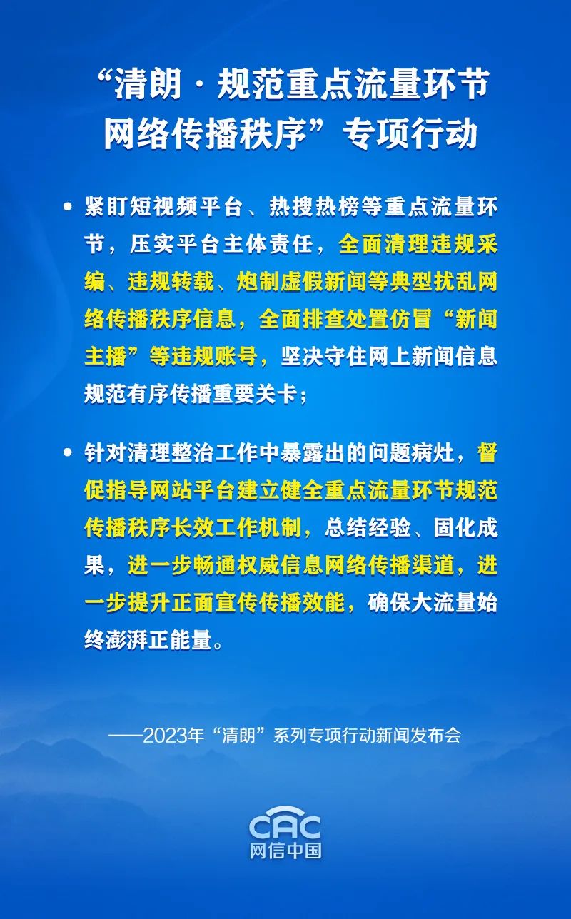 国家网信办有关负责人在发布会上介绍,2023年“清朗”系列专项行动,将以“推动形成良好网络生态”为工作目标,聚焦9方面新情况新问题和难点瓶颈,具体包括:从严整治“自媒体”乱象;打击网络水军操纵信息内容;规范重点流量环节网络传播秩序;优化营商网络环境,保护企业合法权益;生活服务类平台信息内容整治;整治短视频信息内容导向不良问题;2023年暑期未成年人网络环境整治;网络戾气整治;2023年春节网络环境整治。