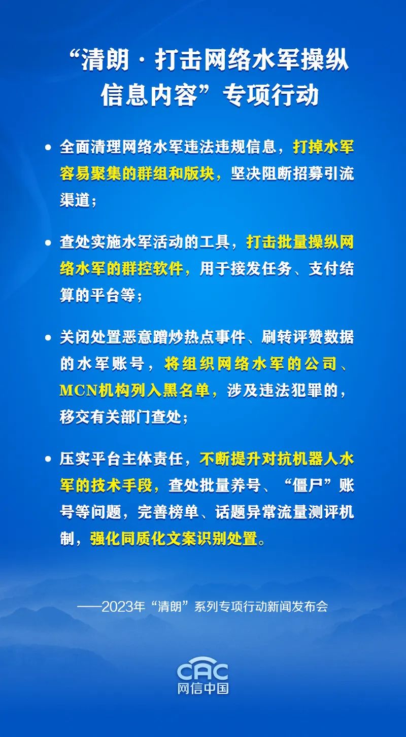 从国家网信办职能讲,今年的水军治理重点聚焦网络水军操纵信息内容问题,主要从以下四个方面整治: