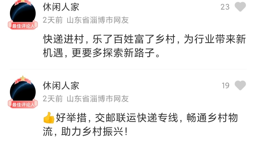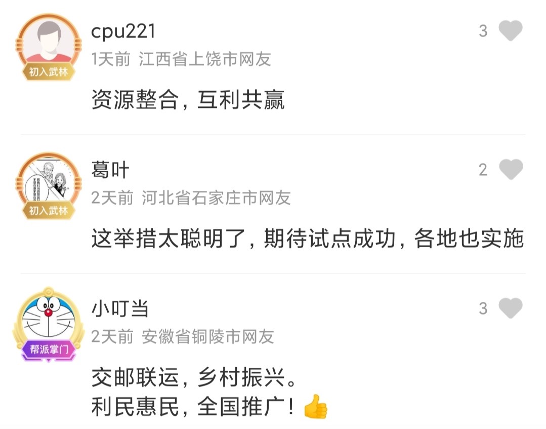 比如,让快递上邮车、上客运班车,最大程度利用现有运输资源,既能让快递进村更便捷、更省钱,也能提高邮车、农村客运班车营收,实现双赢。2022 年,邮快合作在31个省份全面推开,累计覆盖建制村30.6万个,覆盖率达62.3%,代投快件量同比增长115%。交快合作进展迅速,仅2022年就新增农村投递汽车近 2万辆,累计开通交邮联运邮路近2500条。