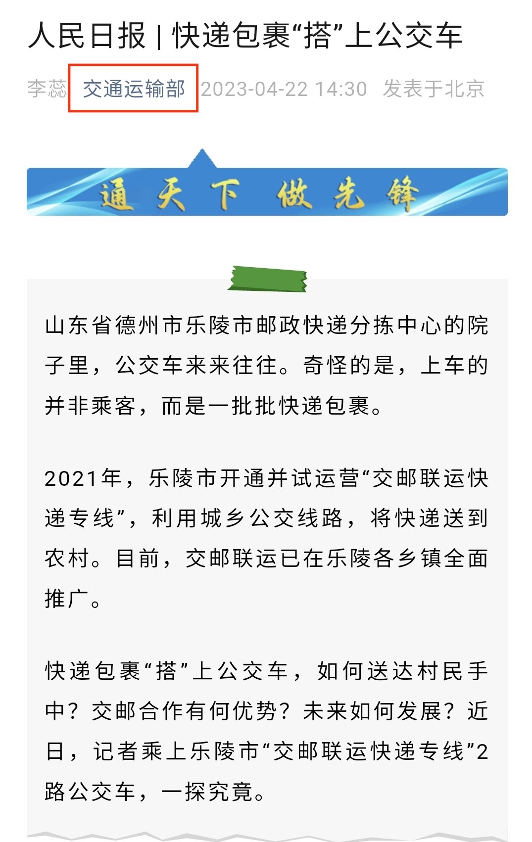 4月18日出版的《人民日报》刊发了《交邮联运畅通乡村物流,山东乐陵——快递包裹“搭”上公交车》文章,报道了山东邮政多部门联合推进农村交邮联运、客货邮发展等工作成效,有效推动了快递进村、农货进城,畅通了乡村物流,拓展了农村消费,助力了乡村振兴、经济循环。全文如下: