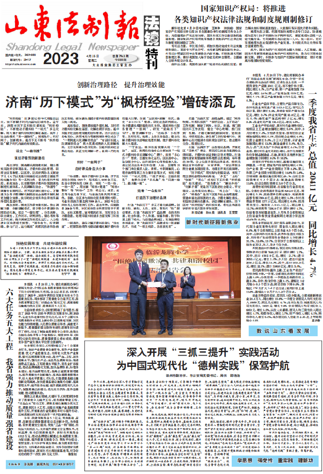 2023年4月25日,《山东法制报》2版头条《理念一变天地宽 “法邮”直通让公平正义更快一步》报道齐河县人民法院集约送达中心创新工作亮点。