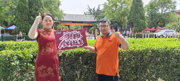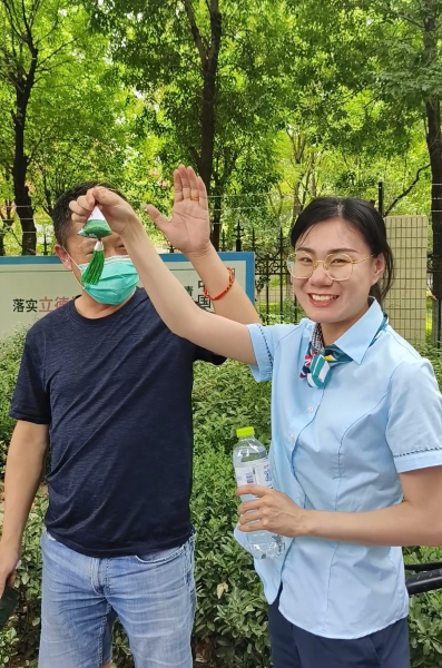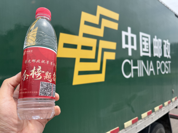 淄博邮政服务人员为高考学子家长送水,送端午节粽子香包,送“金榜题名”手绳。粽子香包高举过头,寓意一举高中(粽)!