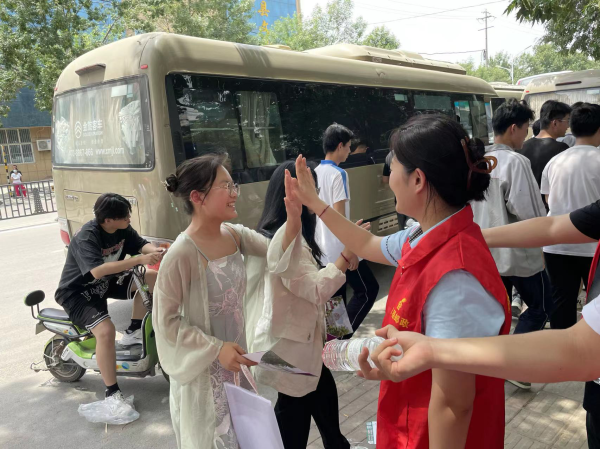“加油!加油!你是最棒的!”聊城莘县邮政的高考服务志愿者与莘县实验高中考点的考生们开心击掌、鼓劲。