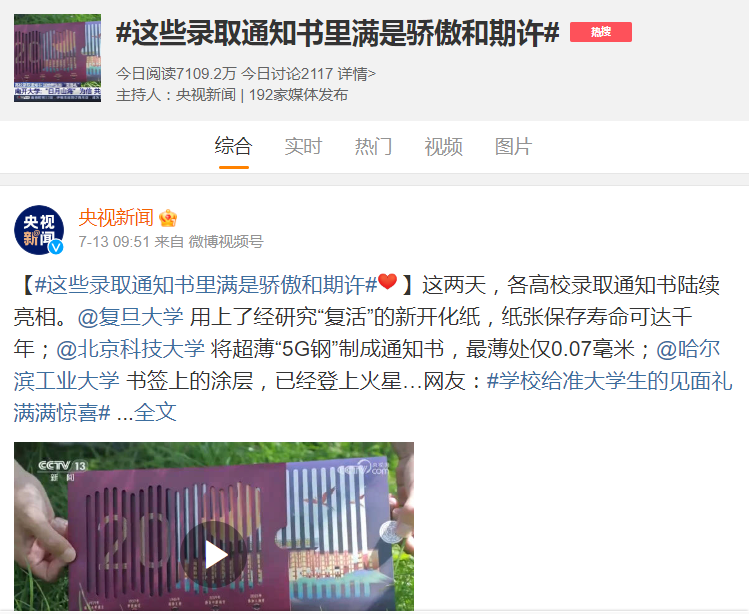 复旦大学用上了经研究“复活”的新开化纸,纸张保存寿命可达千年;北京科技大学将超薄“5G钢”制成通知书,最薄处仅0.07毫米;哈尔滨工业大学书签上的涂层,已经登上火星……网友:学校给准大学生的见面礼满满惊喜。