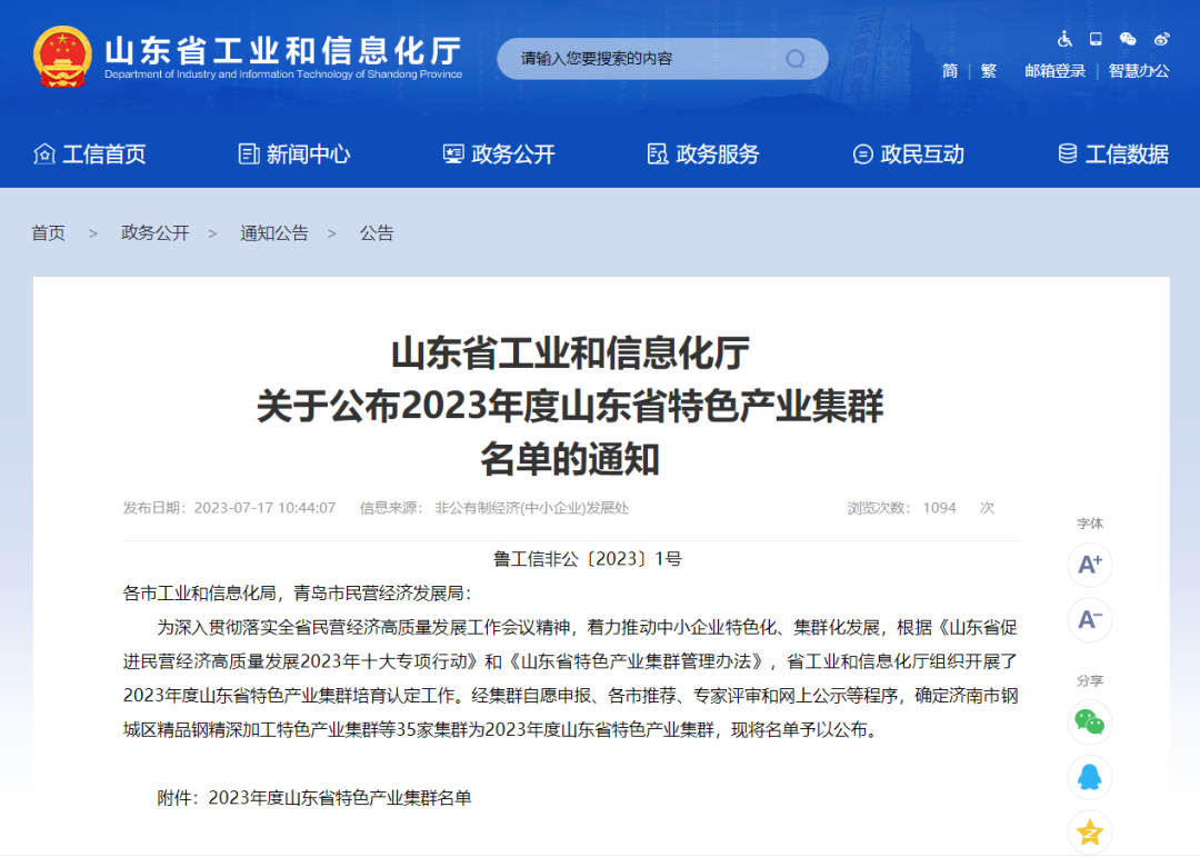 日前,山东省工业和信息化厅公布了2023年度山东省特色产业集群名单。为深入贯彻落实全省民营经济高质量发展工作会议精神,着力推动中小企业特色化、集群化发展,根据《山东省促进民营经济高质量发展2023年十大专项行动》和《山东省特色产业集群管理办法》,省工业和信息化厅组织开展了2023年度山东省特色产业集群培育认定工作。名单公布如下:
