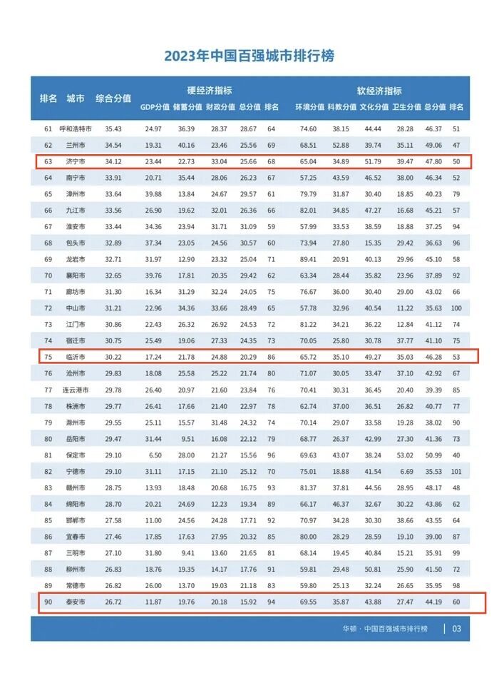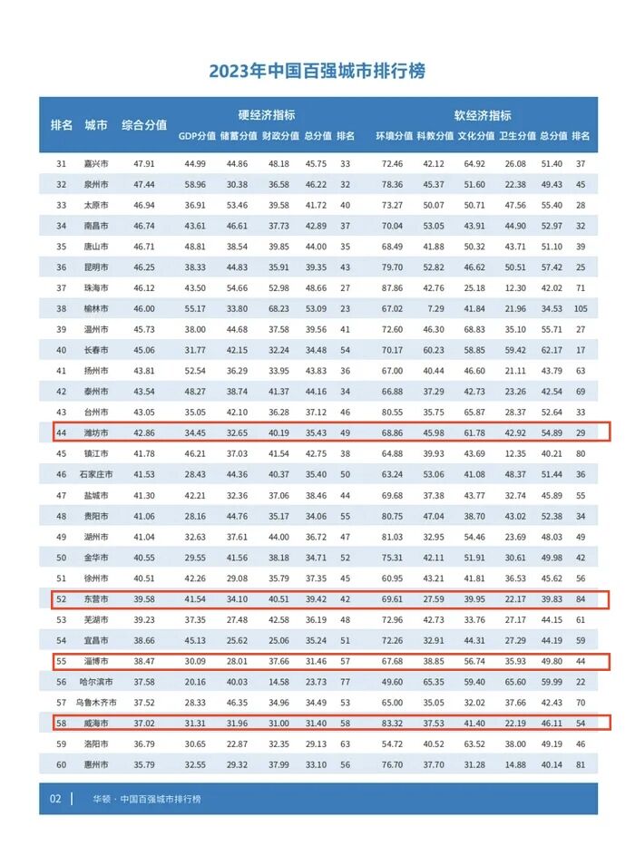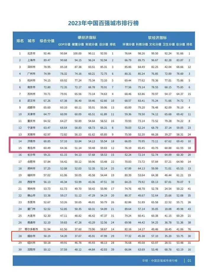 此次上榜的山东城市有12个,上榜数量仅次于江苏。山东省会济南此次以60.85总分排名全国第14、山东第一;青岛以60.49分排名全国第15,烟台28,潍坊44,东营52,淄博55,威海58,济宁63,临沂75,泰安90,德州94,菏泽100。5个省份百强城市上榜率过半,分别是江苏(100%)、福建(89%)、山东(75%)、浙江(73%)、河北(55%)。