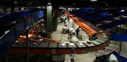 在卸车垛口处,来自全国各地的邮件正在卸车。一条条传送带犹如立交桥般在场地内蜿蜒延伸,一件件包裹经过入口处自动扫描后,搭上传送带不断地向前输送。通过智能分拣设备自动扫描识别系统,邮件被有条不紊地快速分拣、装车,争取尽快到达广大常州市民手中。