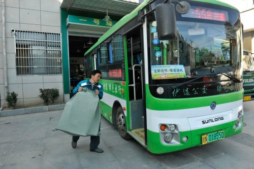 “袁师傅,来签个字!”袁兴斌是一名镇村公交司机,从2019年开始,“邮政快递员”就成了他的第二职业,556路镇村公交从古碑镇到千坪村,每天一趟,送件、载客两不耽误。