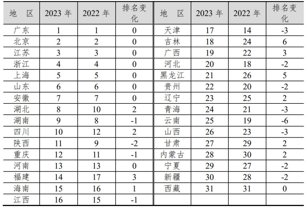 从排名变化情况看,2023年排名上升的地区有10个,分别是吉林、黑龙江、福建、广西、湖北、四川、辽宁、甘肃、内蒙古和海南。其中,东三省排名均有上升,吉林和黑龙江分别上升6位和5位,东北创新转型效果明显;排名下降的地区有12个,其中云南下降6位,创新转型依然面临困难;天津、青海和山西均下降3位;陕西下降2位,跌出全国前十。