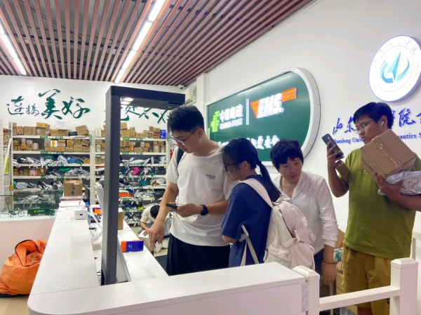 近日,山东航空学院的校园邮局内热闹非凡,来取件、寄件的师生们络绎不绝。