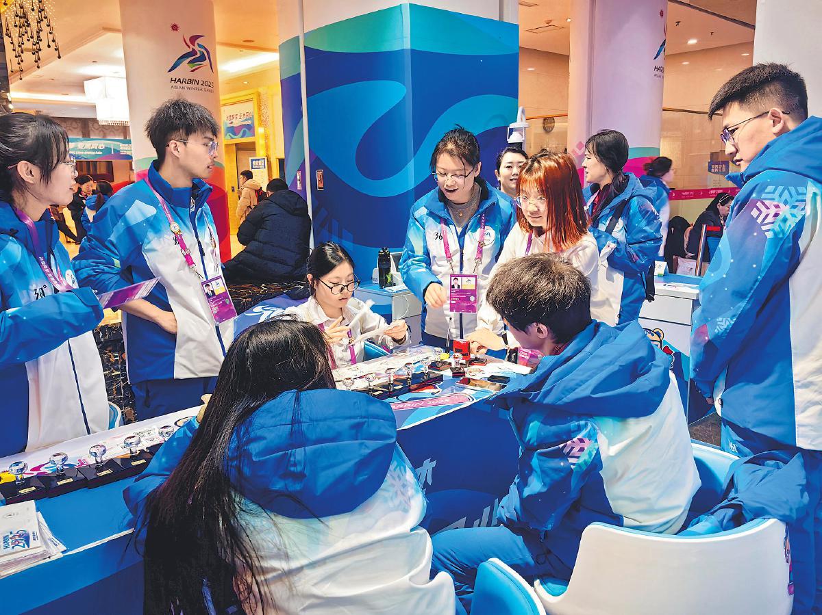 亚冬会志愿者在北大荒运动员村主题邮局打卡留念。□吴晓天 摄
