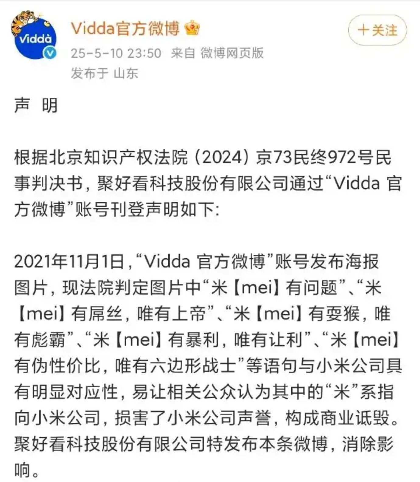 此前,聚好看公司通过其微博账号“Vidda官方微博”发布侮辱、贬损小米公司的虚假信息和误导性信息,损害了小米公司的商业信誉和商品声誉,构成商业诋毁。2023年8月31日,法院做出一审判决:聚好看公司在“Vidda官方微博”账号置顶位置,连续七日刊登声明,消除影响,另赔偿小米公司经济损失及合理开支共计55万元。随后,聚好看公司提起上诉。