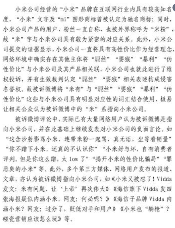 法院认为:被告发表的言论造成小米公司社会评价的降低,且超出舆论监督的合理范围。被告发表的部分言论具有明确的侮辱、贬损性,且缺乏事实依据,构成侮辱、诽谤,侵犯了小米公司名誉权。