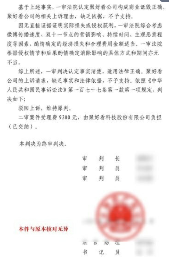 近日,我司收到法院终审判决,驳回聚好看公司的上诉,维持原判。二审法院认为:从语义、语境、特定主体对应性分析,再结合公众认知,一审法院认定聚好看公司发布的微博内容指向小米结论正确;聚好看公司将小米公司视为竞争对手,将与小米公司类似的“年轻人第一台好电视”、“我们的征途是真正的星途大海”作为宣传口号,在此背景下,通过标注拼音试图掩盖指向性,主观存在恶意,且在双十一节点发布,进一步证明其通过诋毁竞品提升自身销量的意图。