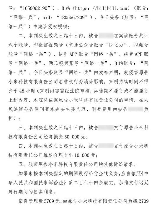 近日,就小米公司与自媒体“民之力”(又名“网络一兵”)网络侵权责任纠纷一案,法院作出一审判决。法院认定被告存在侮辱、诽谤行为,侵害了小米公司的名誉权。判令被告删除在抖音、头条、哔哩哔哩、西瓜视频、快手、微信视频号、微信公众号平台账号内发布的侵权内容,发布声明消除给小米公司造成的负面影响,并赔偿小米公司各项损失共计6万元。