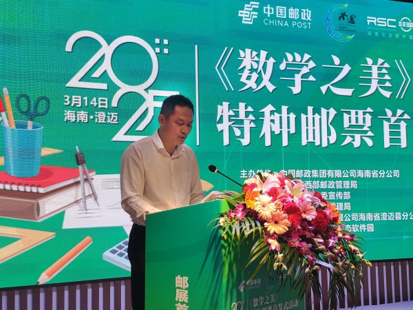 刘彦波表示,此次中国邮政发行的《数学之美》特种邮票,展现了人类探索数学真理的历程,是对科学精神的致敬。选择在澄迈老城,在海南自由贸易港生态软件园举办邮票首发式,也是对海南“向数图强”战略以及澄迈打造“数智澄迈”举措的致敬。海南邮政还特别设计了纪念邮戳,融合了多种数学元素。希望借此邮票,让青少年感受数学趣味,让公众领悟科学价值,向世界展示海南“硬科技”与“软文化”交融的魅力,以数为媒、以邮为桥,共同谱写数字中国与美丽海南的美好篇章!